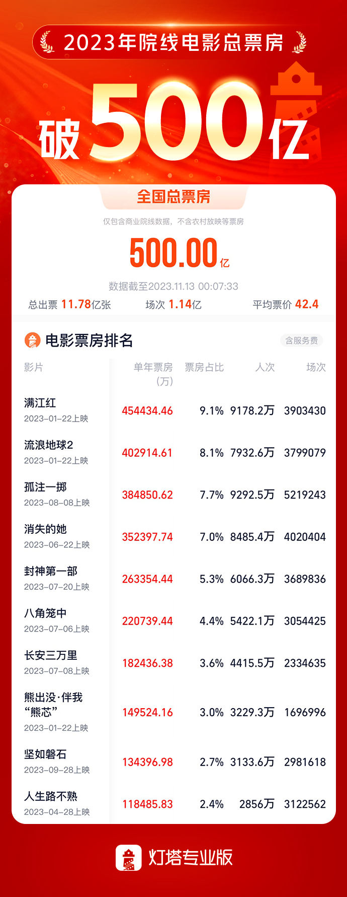 據(jù)中國國家電影專資辦初步數(shù)據(jù)統(tǒng)計顯示,2023年中國電影年度票房于11月13日突破500億元(人民幣,下同),用時317天。其中,國產(chǎn)影片票房417億元,占比達(dá)83.4%。